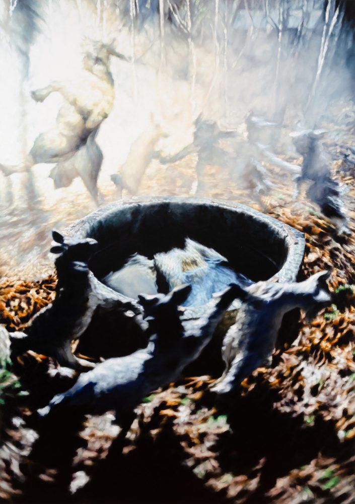 En el cuento El lobo y los siete cabritos de los Hermanos Grimm, el pozo se vuelve el centro. El lobo es engañado y ahogado, su vientre lleno de piedras, y arrojado por el eje vertical y oscuro del medio. Los cabritillos, renacidos desde el vientre del lobo, celebran no solo la supervivencia, sino el triunfo de la inocencia sobre el peligro. Es la restauración del orden—ese breve y extático momento en que el miedo es superado y transformado en movimiento ritual.